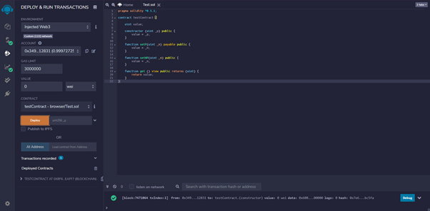 Once compiled you should see a tick mark next to the compiler and we are good to deploy the contract into Fusenet. Please click on “Deploy and run transaction” below the compiler option. Select “Injected Web3” from the drop down of Environment and adjust the gas value and click on “Deploy”. You should confirm the transaction on your Metamask and wait for the transaction to be confirmed on-chain.