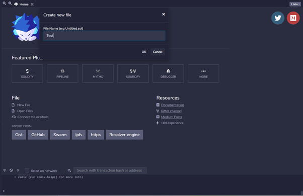 Next step is creating/importing the contract. You can write the contract using “Create” or you can import the contract from various options like Gist, Github, Swarm etc.