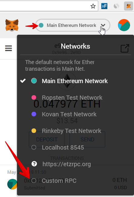 - To set up Mix as a new network on Metamask. Click on the network selector at the top of the app and then choose "Custom RPC" from the list: