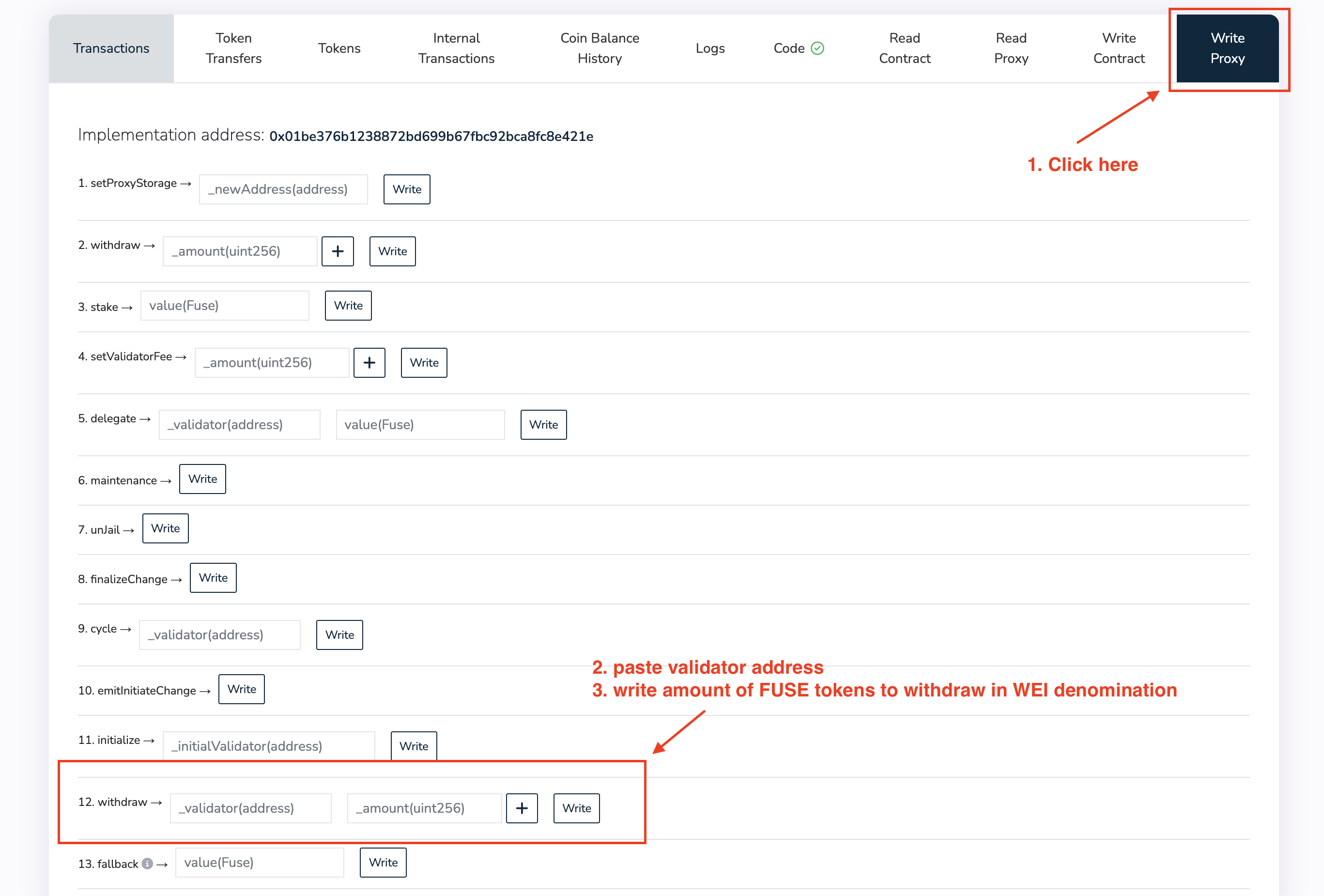 - Click on the ‘write proxy’ section on the consensus contract address.