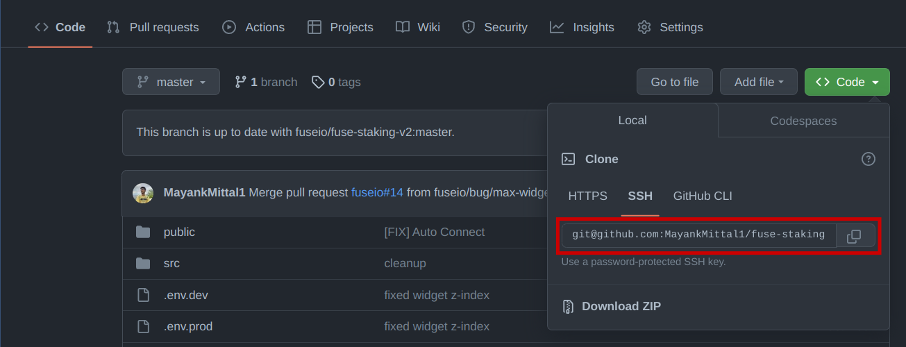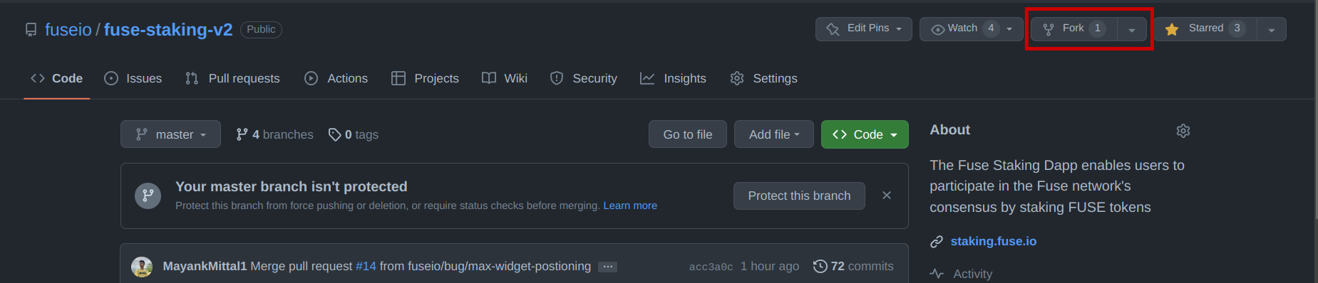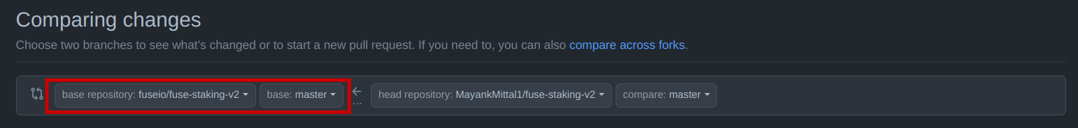 On the original repository page, you should see an option to compare and open a new pull request. Click on it, and select your branch as the source branch and the target branch as fuseio/fuse-staking-v2 master where we want it merged, provide a short description, and ask for a review. If the review is a success, your PR will be merged and changes will be live within a few minutes of merging.